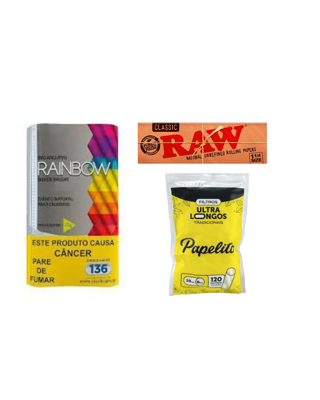 Kit Rainbow, seda Raw Classic 1 1/4 e Filtro Papelito Ultra Longo